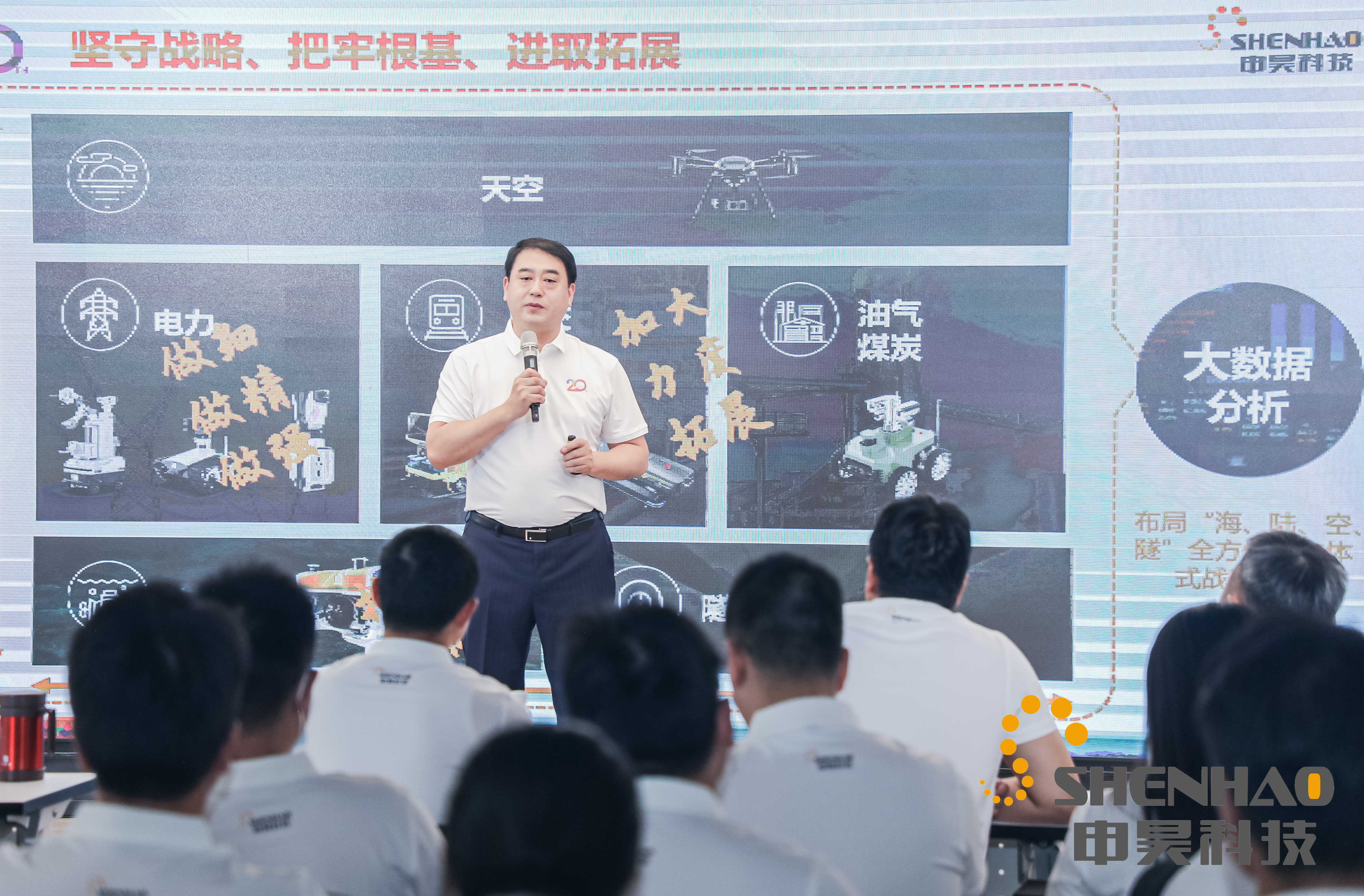 陳如申董事長發表致辭,他表示,申昊科技創業廿載,跟隨國家的路線,堅守國家發展戰略規劃,一步一個腳印,逐步壯大,從最初的電動車檢測,到電力固定端檢測;再到室外、室內的電力、石油化工巡檢機器人;拓展到軌道交通領域的檢測線路的機器人、檢測車底的機器人、檢測剛性接觸網的機器人;發展至今,產品線正在向著企業戰略“海陸空隧”各個領域突破。產品線越來越豐富的同時,企業規模也在不斷發展壯大。
