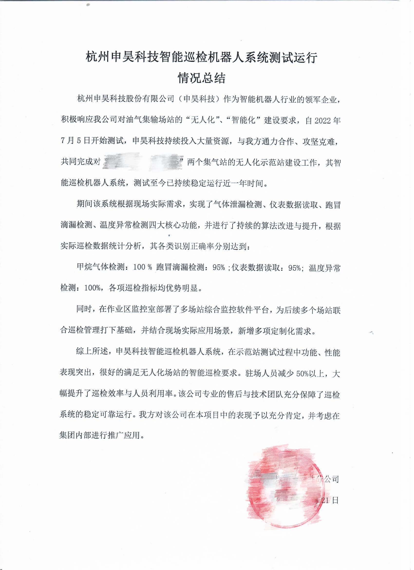 申昊科技積極響應(yīng)油氣集輸場(chǎng)站的“無(wú)人化”、“智能化”建設(shè)要求,與相關(guān)單位通力合作、攻堅(jiān)克難共同完成示范站建設(shè)工作。如今油田多了一位“智能幫手”——申昊科技機(jī)器人智能巡檢系統(tǒng),成為了擁有智慧的“無(wú)人化場(chǎng)站”示范站,該系統(tǒng)已經(jīng)成功連續(xù)運(yùn)行一年,獲得了客戶的高度評(píng)價(jià)。